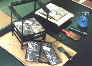 次に採取した防水層のサンプルを試験体サイズにカットします。この防水層はアスファルト防水の為、アスファルト部分と基材(中に入っている繊維)部分を別々に検査します。